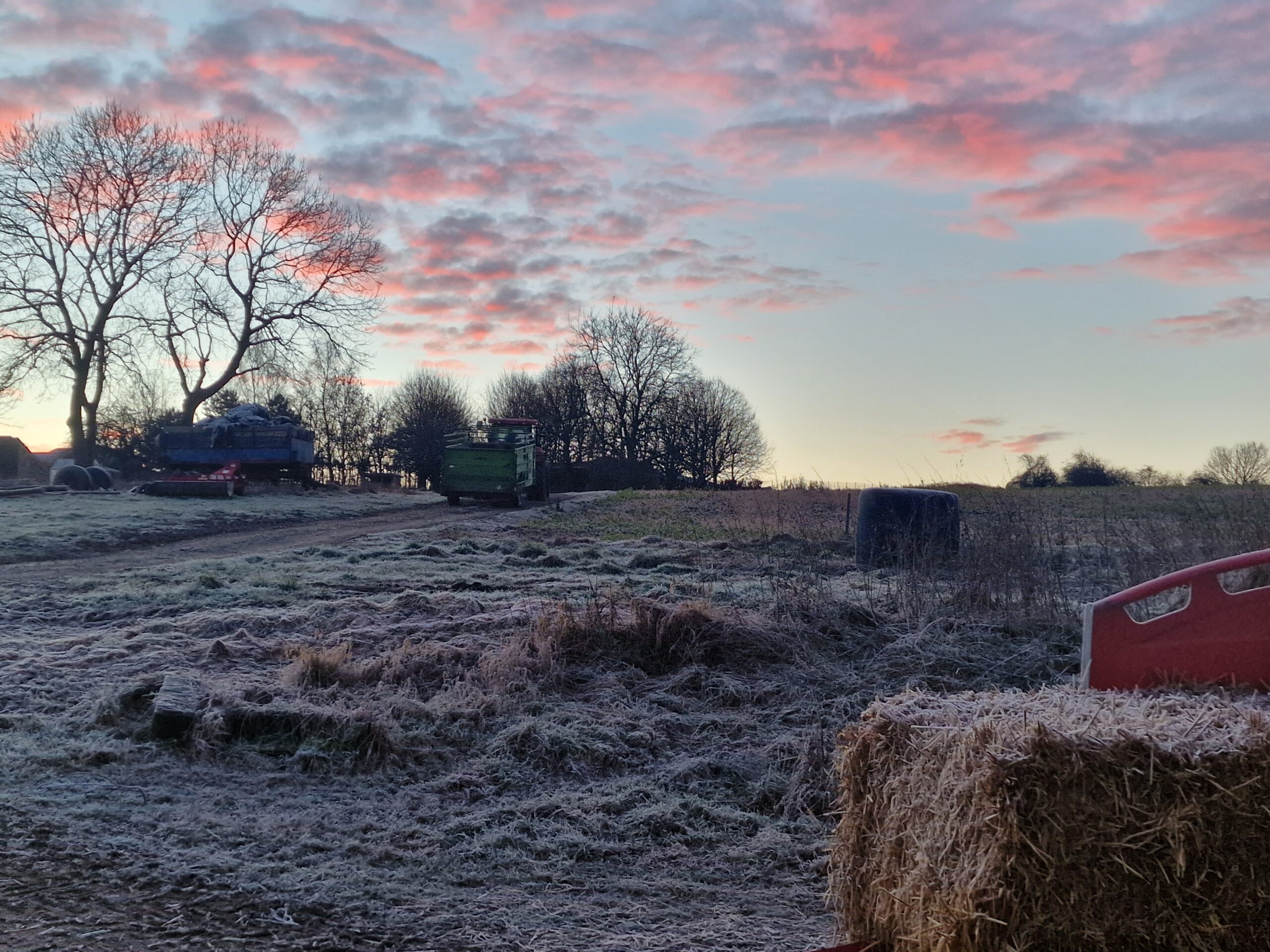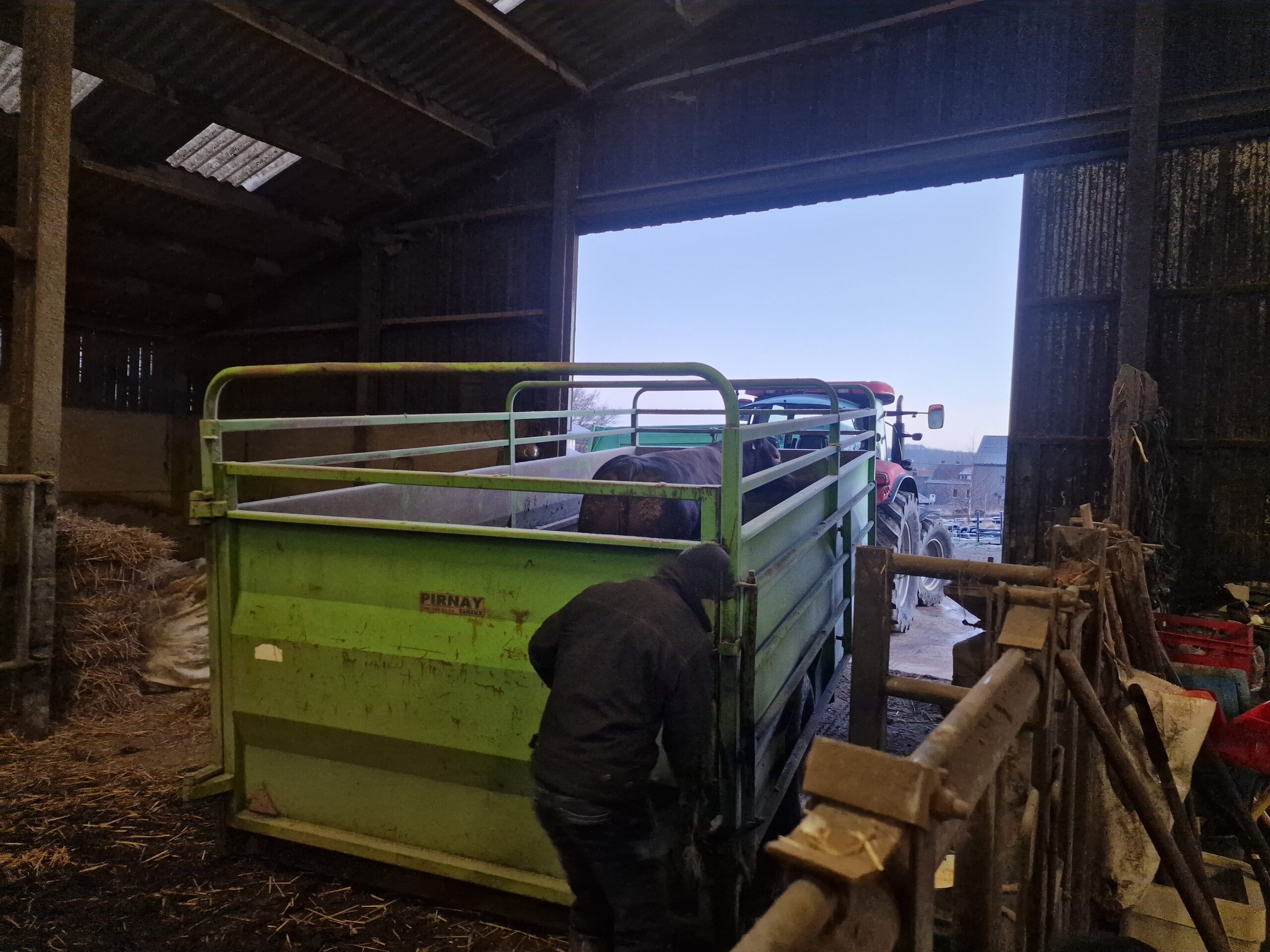 Ce matin, sous un beau soleil levant, Jean François conduisait une de nos vaches à l’abattoir de Rochefort. La viande qui sera proposée samedi prochain proviendra de cet animal élevé avec soin. En effet, on peut vous raconter ici l’histoire de chaque bête côtoyé au quotidien. Elle, elle avait 6 ans, a eu 3 veaux, était de mère de race Blanc Bleue Belge et de père de race Blonde d’Aquitaine. Cela explique son caractère un peu sauvage, et son intérêt pour les sauts de clôture (on a hésité à l’inscrire au jumping de Liège